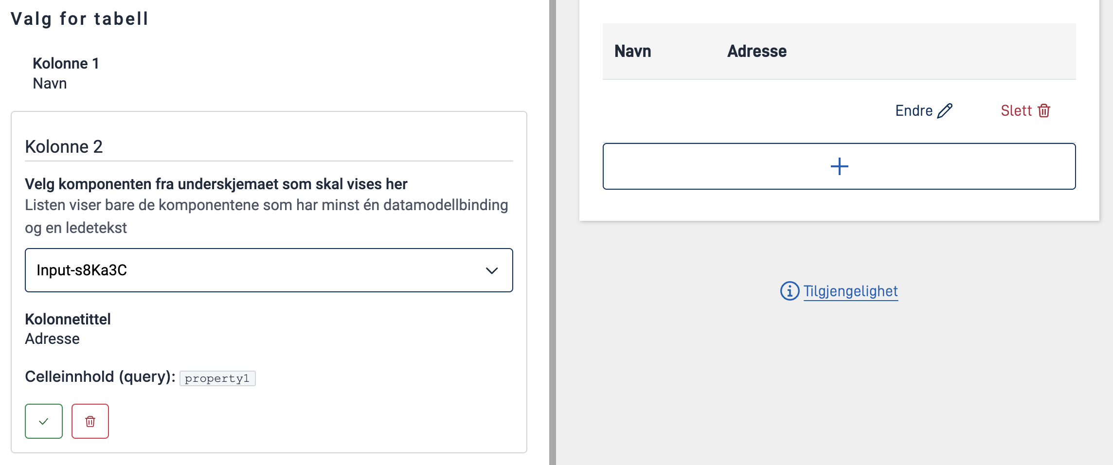 Navigate back to the main form and click on Tabell for underskjema. Open the accordion Tekster and add the desired columns. - Configure the columns