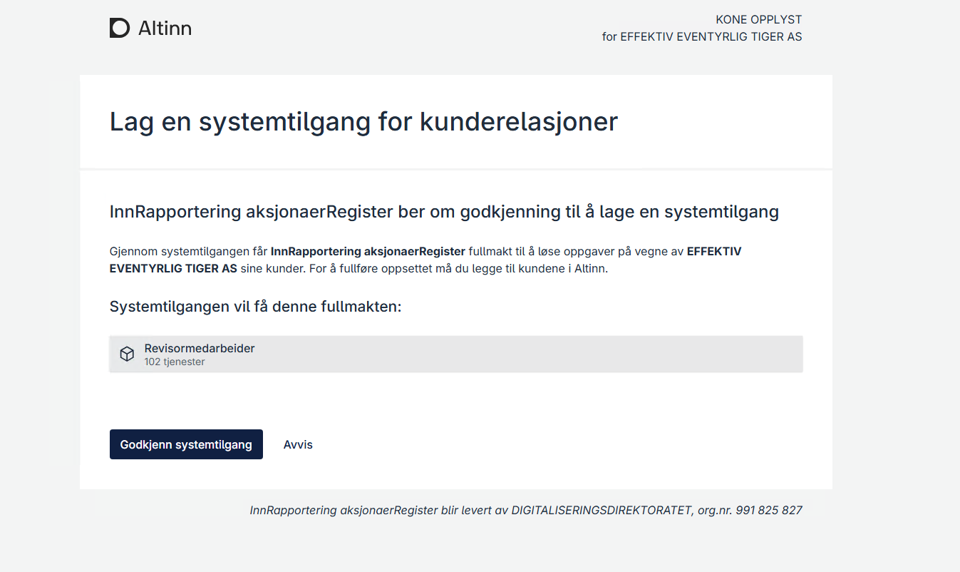 - The Tax Administration authorizes that the system user has the right to report the shareholder register for Customer A.