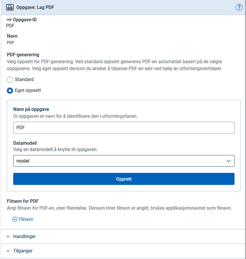 Det er valgfritt å inkludere <altinn:filenameTextResourceKey>. Her oppgir du en tekstressursnøkkel som brukes som filnavn, med støtte for språk og variabler. Utelater du den, får PDF-en applikasjonens navn som filnavn.