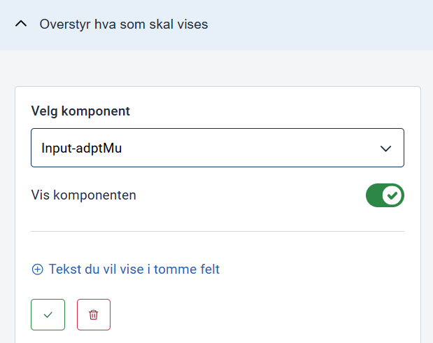 Hvis du vil, kan du overstyre hvordan enkeltkomponenter vises i oppsummeringen. Åpne Overstyr hva som skal vises, og klikk på knappen Lag en ny overstyring. Velg komponenten du vil overstyre i nedtrekkslisten, og spesifiser hvilke egenskaper du ønsker å endre.Overstyre en komponent