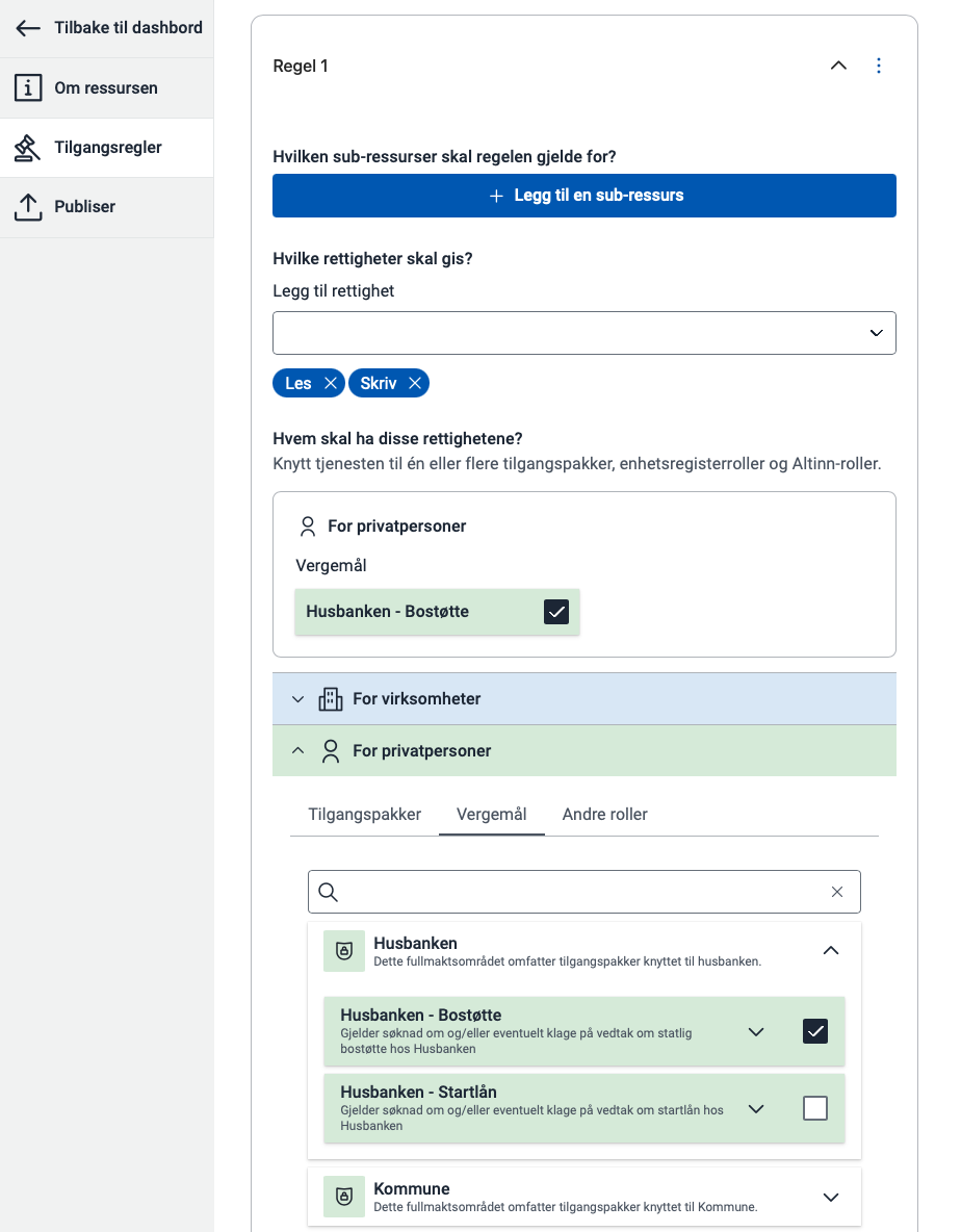 Det første steget er å opprette tilgangsregler som definerer hvilke handlinger de ulike vergemålstypene gir tilgang til på tjenesten. Du kan gjøre dette via API eller i Policy editor i Ressursadministrasjon.
