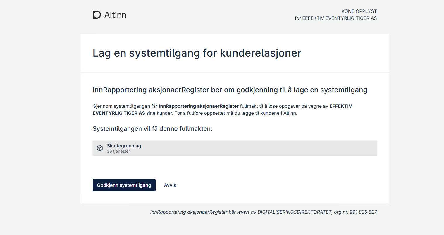 - SKD autoriserer at systembrukeren har rettighet til å rapportere aksjonærregisteroppgaven for Kunde A.