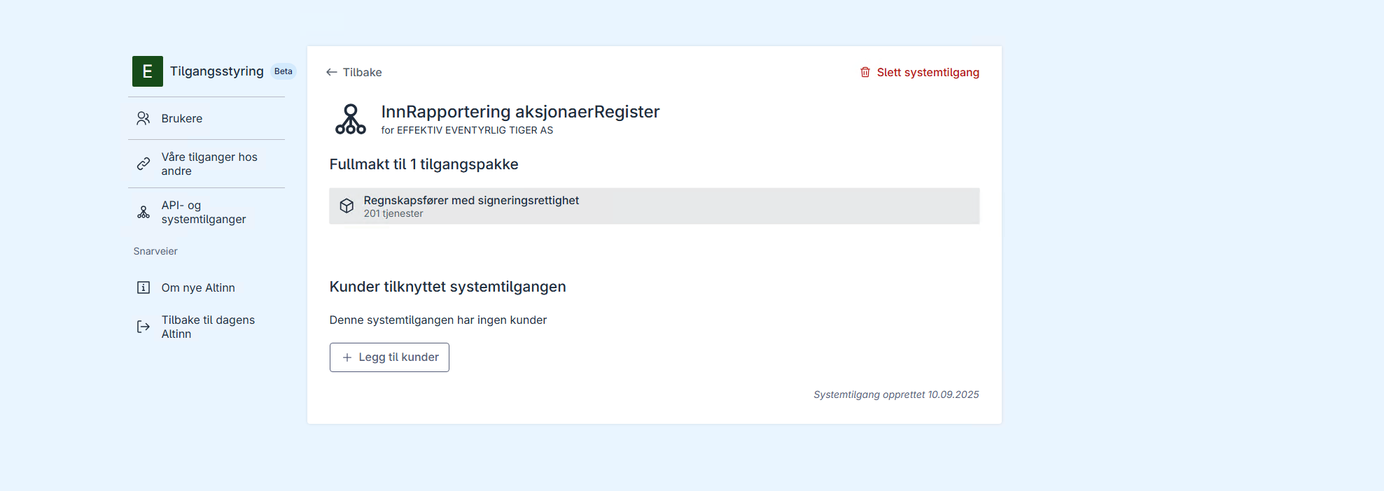 - Regnskapsfører har opprettet en systembruker for klientforhold knyttet til sluttbrukersystemet.