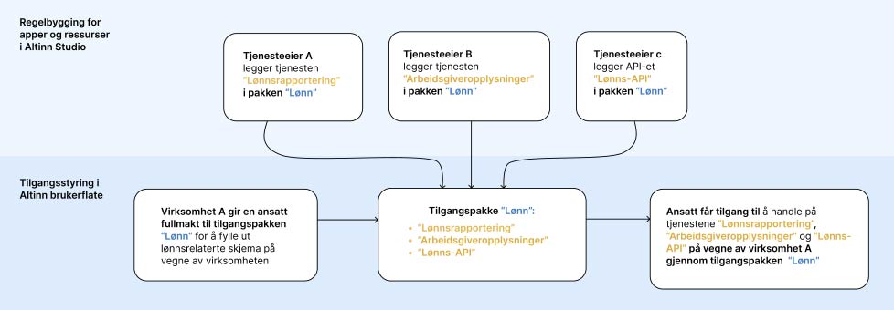 Tilgangspakker samler tjenester og ressurser tematisk, basert på hva som ofte brukes eller løses sammen, slik at virksomheter kan gi nødvendige fullmakter til ansatte og systemer uten å måtte gi fullmakt til én og én tjeneste. I Altinn 3 erstatter tilgangspakker de tidligere Altinn-rollene i praksis.